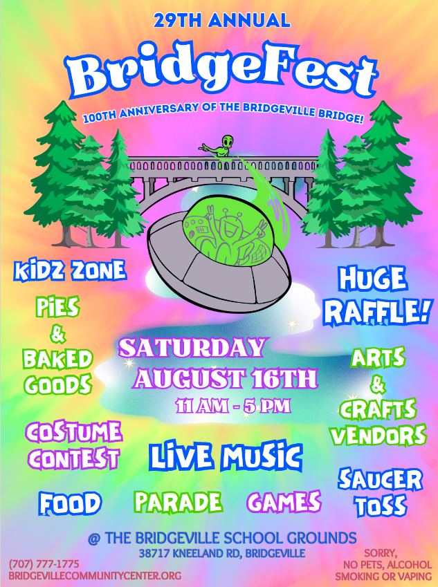 (or write BridgeFest, PO Box 3, Bridgeville, CA, 95526, Earth, Third Planet from the Sun)